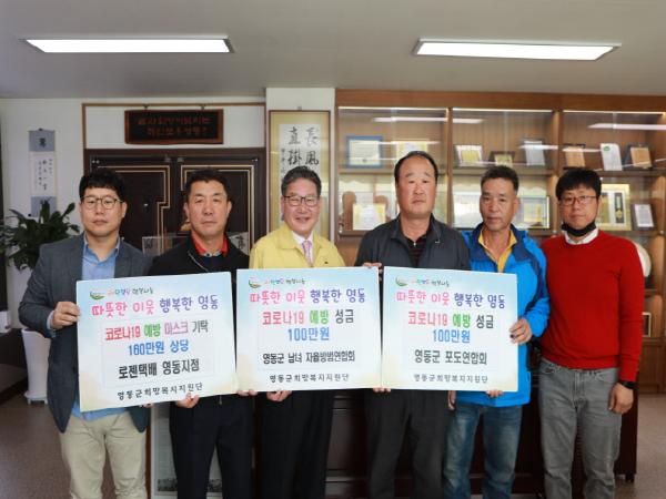 이어 로젠택배 영동지점(대표 김석훈)이 160만원 상당의 마스크 800장을, 영동군치과의사회(회장 허남석)가 회원들의 뜻을 모아 100만원을 전달하며 지역사회와 온정을 나눴다.
