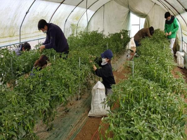 당진시 농업기술센터 공무원들이 지난 20일 면천면 문봉리 꽈리고추 생산단지를 찾아 꽈리고추 수확 작업을 돕는 등 당진시가 코로나19 장기화로 인해 농촌일손 부족으로 어려움을 격고 있는 농가를 돕기 위해 나섰다.