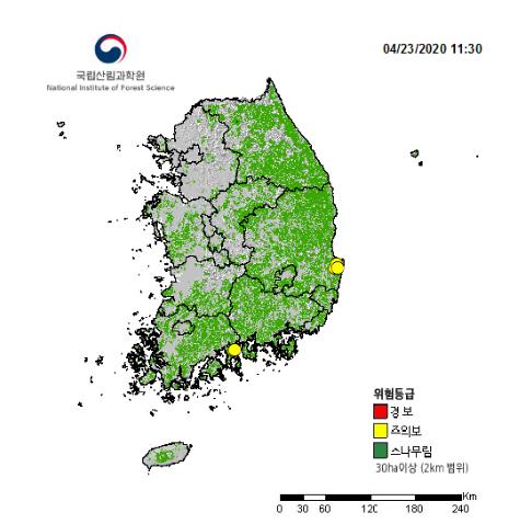 산림청 국립산림과학원(원장 전범권) 산불예측·분석센터는 금일(23일) 낮 동안은 전국에 6∼11m/s의 강풍이 불고, 내일부터 모레(25일)까지는 강원 영동 북부, 경남 해안에는 9∼16m/s의 거센 바람이 예상됨에 따라 강원지역 및 경북· 경남 ·부산· 울산 지역에 대형산불 위험주의보를 발령하였다.