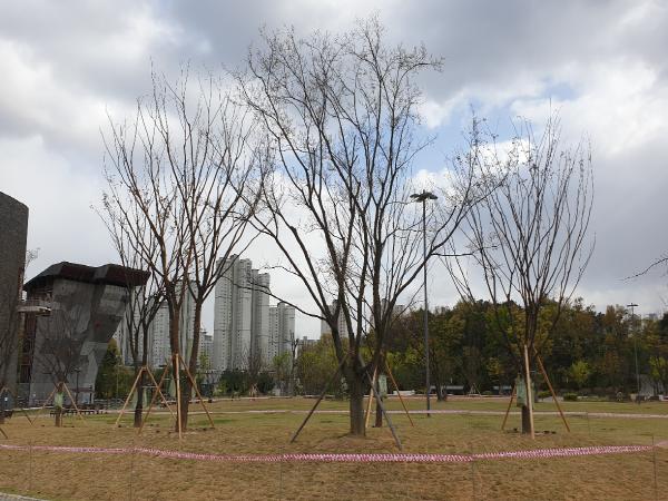 이에 수원시는 재미난밭을 도시 숲 조성공사 대상지로 선정, 이번에 직경이 30㎝에 달하는 커다란 느티나무 23주를 식재했다.