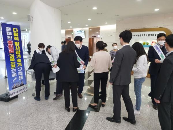 충북도 행정국 직원들은 24일 대전시청?세종시청?충남도청을 방문하여 4세대 다목적 방사광가속기 충북 오창 유치를 위한 서명운동과 홍보활동을 함께 펼쳤다.○ 지난 달 30일 충북, 충남, 대전, 세종 등 충청권 4개 시·도지사 참여하는 ‘다목적 방사광가속기 충청권 유치 추진위원회’를 출범한 이후, 범 충청권 공감대 확산과 지지기반 구축을 위해 본격적으로 나섰다.