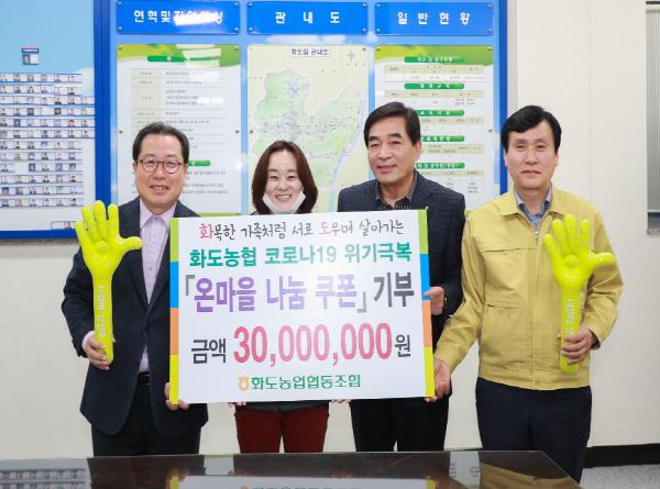 최상복 화도농협 조합장은“화도농협은 조합원들과 함께 만들어가는 사회적 협동기업으로 늘 지역주민들과 슬픔과 기쁨을 함께 하고자 노력하고 있다. 이번 코로나19의 위기에서 행복한 일상으로 복귀하는데 작게나마 도움이 되길 바라는 마음에 기부에 참여하게 됐다”고 후원의 취지를 밝혔다.