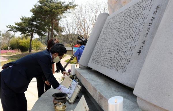 행사는 무장포고문 낭독, 무장기포가 수록된 한국사 교과서 봉정, 헌화 및 분양 등의 순서로 진행됐다.