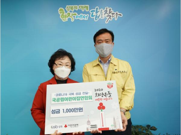 성북구(구청장 이승로)는 지역 내 국공립어린이집 연합회(회장 황인숙)가 코로나19로 어려움을 겪고 있는 이웃을 지원해 달라며 성금 1천만원을 기탁하였다고 24일 밝혔다.