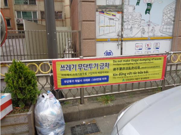 인천 계양구(구청장 박형우)가 관내 외국인 밀집지역에 한글과 3개국어로 표기한 무단투기 예방 현수막을 게시하였다.