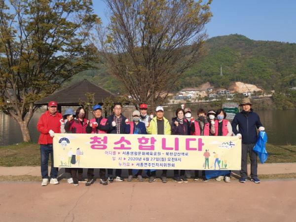 지난 4월 27일 양평군 서종면 주민자치위원회(위원장 이순화)는 코로나19로 무기한 연기된 월례회의 일정을 대신해 북한강변 산책로에 위치한 무너미나루터에 모여 그간의 안부를 전했다. 마스크가 얼굴의 반 이상을 가렸지만 마주 보는 눈빛 속에 담긴 반가움이 코로나19로 멀어졌던 사회적 거리를 무색케 했다. 눈인사도 잠시, 집게와 쓰레기봉투를 든 두 손이 바쁘게 움직이기 시작했다.
