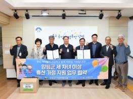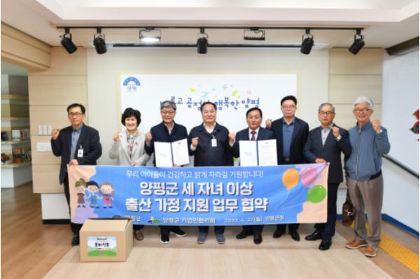 양평군은 양평군기업인협의회 및 ㈜정우계육, 광이원과 2020년 4월 27일 세 자녀 이상 출산·입양가정 지원을 위해 업무협약(MOU)을 체결 했다.