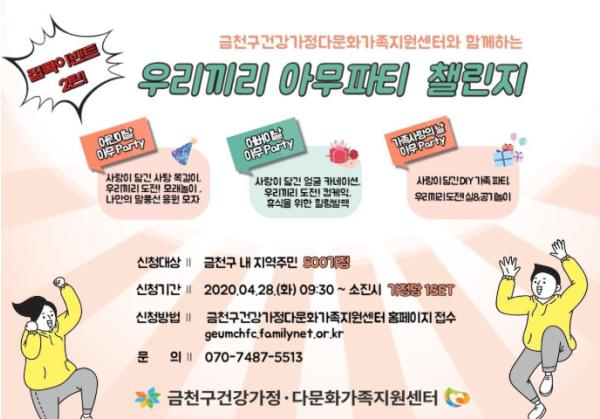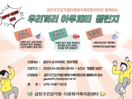 금천구(구청장 유성훈)가 다가오는 5월 연휴기간 느슨해진 ‘사회적 거리두기’에 대한 경각심을 일깨우고 적극적인 동참을 유도하기 위해 집콕 이벤트 2탄 ‘우리끼리 아무파티 챌린지’를 진행한다.