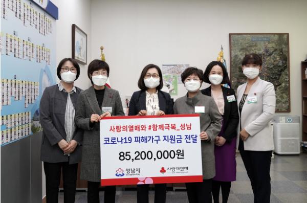 시는 이날 오후 4시 시장 집무실에서 은수미 성남시장과 최은숙 경기사회복지공동모금회 사무처장 등이 참석한 가운데 ‘사랑의 열매와 #함께극복_성남, 코로나19 피해가구 지원금 전달식’을 했다.