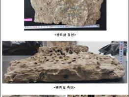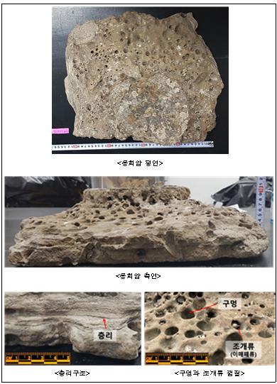 수심 약 56m에서 채취된 이 암석조각은 화산분출물이 쌓여서 굳어진 응회암으로, 층리구조와 조개류가 서식한 흔적으로 추정되는 다수의 구멍들(borings)을 가지고 있었다.