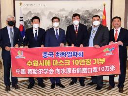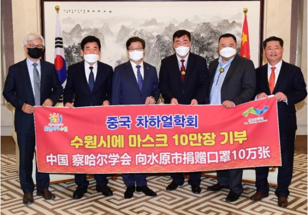 중국 차하얼학회(察哈???)가 수원시에 의료용 마스크 10만 매를 기부했다.