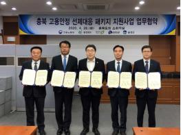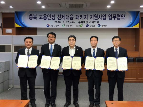 고용노동부와 충청북도?청주시?진천군?음성군(이하 ‘충청북도 컨소시엄‘)은 4월 28일 충북도청 소회의실에서 ?충북 고용안정 선제대응 패키지 지원사업?의 성공적인 추진을 위한 업무협약(공모 선정)을 체결하였다.