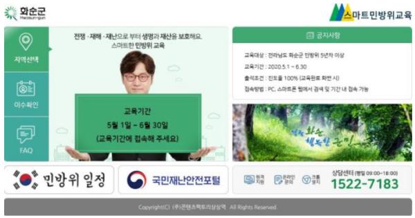 2020년도 민방위 사이버 교육은 화순군 소속 5년 차 이상 지역과 직장 민방위 대원 1405명을 대상으로 진행한다.