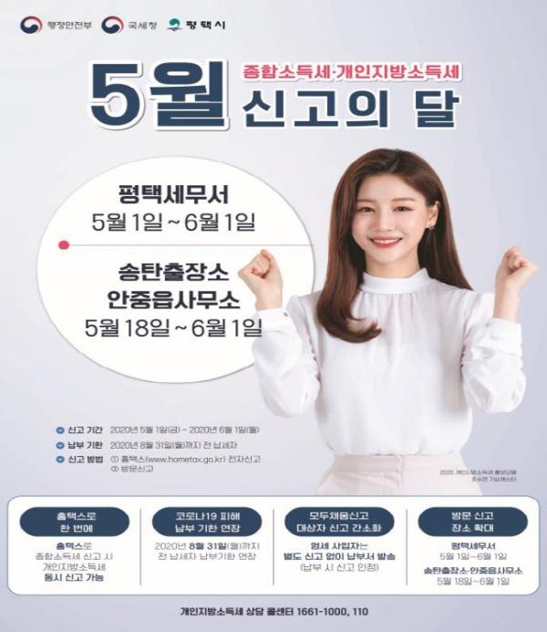 평택세무서는 5월 1일부터 6월 1일까지, 송탄출장소 및 안중읍사무소는 5월 18일부터 6월 1일까지 운영하며 납세자가 원하는 곳에 방문해 종합소득세와 개인지방소득세를 동시에 신고할 수 있다.