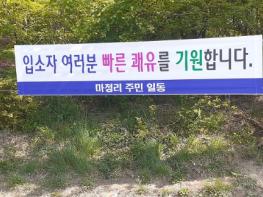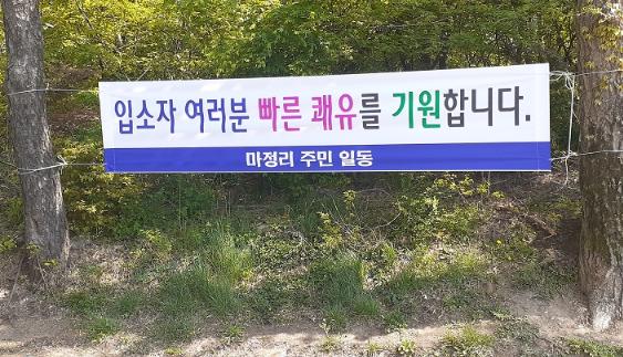 안성시 공도읍 마정리 주민들이 코로나19 확진자들의 빠른 쾌유를 기원하는 마음을 담은 현수막을 우리은행 연수원 국제생활치료센터 앞에 게시하여 훈훈한 감동을 주고 있다.