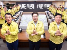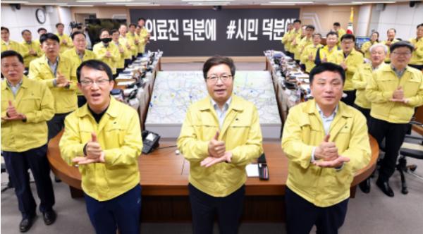 염태영 시장과 이날 확대간부회의에 참석한 간부 공직자들은 회의 후 ‘덕분에 챌린지’에 참여했다. ‘덕분에 챌린지’는 코로나19 환자 진료에 힘쓰고 있는 의료진을 응원하는 캠페인이다.