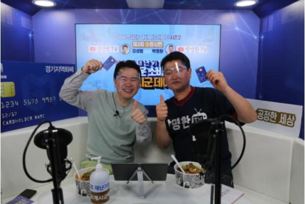 이날 행사에는 경기도 재난기본소득을 ‘수원페이’로 잘 소비하는 것을 보여주기 위해 개그맨 강성범과 한국프로야구 통산 103승의 전 야구선수 박명환 코치가 참여했다. 두 사람은 최근 자신의 이름을 딴 유튜버로도 왕성하게 활약 중이다.