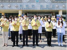 김 산 군수는 이 날 캠페인에서 보건소 직원 30여명과 함께 수화동작을 취하며 코로나19와 사투를 펼치는 의료진들에게 존경의 마음을 전했다.