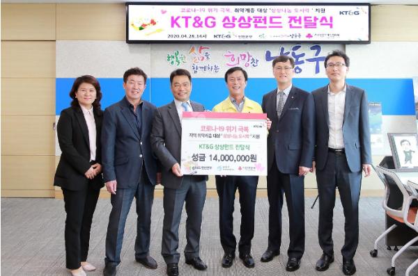 인천 남동구(구청장 이강호)는 지난 27일 KT&G 인천본부(본부장 조남웅)로부터 코로나 19극복을 위한 ‘상상펀드’ 성금 1,400만원을 기탁 받았다.