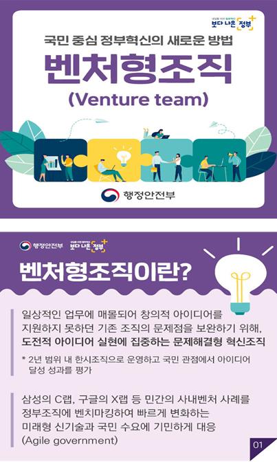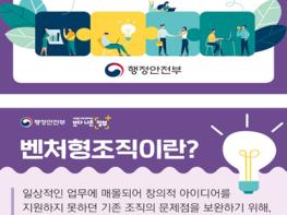 벤처형조직은 일상적인 업무에 매몰되어 창의적 아이디어를 지원하지 못하던 기존 조직의 문제점을 보완하기 위해, 공무원들이 직접 정책·서비스 혁신을 위한 아이디어를 내고 전담팀을 구성하여 실제 정책과 서비스로 구현하는 혁신형 조직이다.