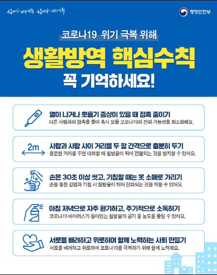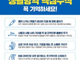 한편, 생활방역 핵심수칙으로는 ▲열이 나거나 증상이 있을 때 접촉 줄이기 ▲사람과 사람 사이 거리를 두 팔 간격으로 충분히 두기 ▲손은 30초 이상 씻고, 기침할 때는 옷소매로 가리기 ▲아침 저녁으로 자주 환기하고, 주기적으로 소독하기 ▲서로를 배려하고 위로하며 함께 노력하는 사회 만들기 등이 있다.