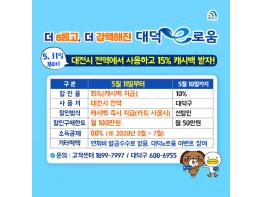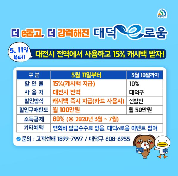 5일 구에 따르면 지난해 7월 대전시 최초로 발행해 선풍적인 인기를 끌며 지역경제 활성화의 마중물이 되어온 대덕e로움은 기존 10% 선할인 방식을 변경해 사용한 금액의 15%를 캐시백으로 지급하게 된다. 또한 코로나19 확산으로 인한 경기침체 극복과 소비촉진을 위해 개인 구매한도를 월 50만 원에서 100만 원으로 상향한다. 사용처가 대전시 전역으로 확대됨에 따라 백화점·대형할인마트·유흥업소 등을 제외한 IC카드 단말기를 사용하는 대전시 모든 점포에서 사용 가능해진다.