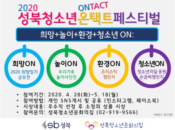 구립 성북청소년문화의집에서 주관하는 ‘성북 청소년 온택트(Ontact)페스티벌’은 비대면으로 사람들과 소통할 수 있는 ‘온택트(Ontact)’라는 새로운 문화 트렌드를 반영한 청소년 문화 공유 축제로서, 5월 청소년의 달을 기념하여 청소년의 능동적이고 자주적인 주인의식을 고취하고 청소년 활동 및 육성에 대한 지역주민의 참여와 관심을 높일 수 있는 다양한 온라인 프로그램을 제공한다.