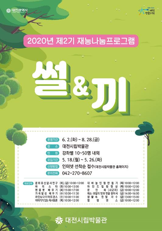 제2기 재능나눔프로그램 ‘썰&끼’는 시립박물관이 코로나19로 긴 잠정 휴관을 마치고 오는 12일 개관을 앞두고 있어 오는 18일부터 26일까지 13개 강좌에 320여 명의 수강생을 모집한 후, 내달 2일 개강해 8월 말까지 진행된다.