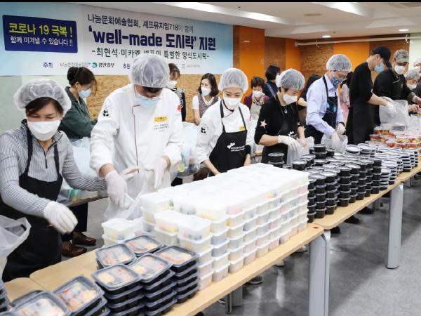 나눔협회 주최로 열린 이날 ‘스타셰프 well-made 도시락’ 나눔 행사에는 ‘수미네 반찬’, ‘놀면 뭐하니?’ ‘유산슬’, ‘사장님 귀는 당나귀 귀’ 등 예능 프로그램 출연 셰프들이 총출동했다. 최현석?여경래?미카엘?박은영?박가람?김선엽?한기훈 셰프가 참여해, ‘최현석, 미카엘의 특별한 양식 도시락’ 300인분을 만들었다.