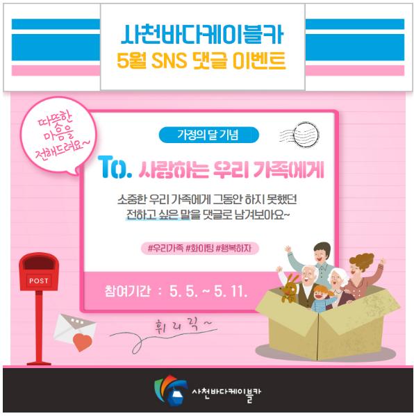 사천시시설관리공단(이사장 박태정)은 가정의 달 5월을 맞아 사천바다케이블카를 널리 알리기 위해 전 국민 누구나 참여 가능한 SNS 댓글 이벤트를 진행한다고 밝혔다.