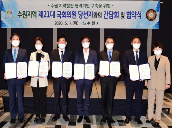 염태영 수원시장과 제21대 총선 국회의원 당선자 5명은 5월 7일, 라마다 프라자 수원 호텔에서 간담회를 열고, ‘수원 지역발전 협력기반 구축을 위한 공동협약’을 체결했다.