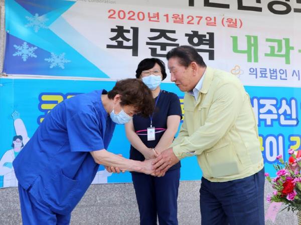 코로나19 대응 의료진 감사 캠페인의 하나로 추진된 이날 방문에서 조 군수는 박문수 병원장을 비롯한 병원 관계자에게 과일과 카네이션 꽃바구니 등 격려품을 전달하고 직원들의 노고를 격려했다.