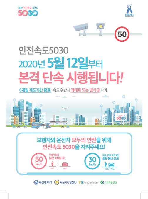 부산광역시와 부산지방경찰청은 교통사고 사망자 감소 및 보행자 교통안전 강화를 위해 지난해 11월 11일부터 부산 도심 전역에 전국 최초로 시행 중인 ’안전속도 5030‘의 계도기간 운영을 마치고, 5월 12일 0시를 기점으로 본격 단속을 시행한다고 밝혔다.