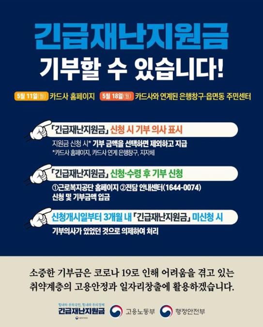긴급재난지원금을 기부하고 싶으면 신청 때 기부의사를 표시하면 된다. 지원금의 일부만 기부할 경우 기부금액을 제외한 나머지 지원금이 지급된다.