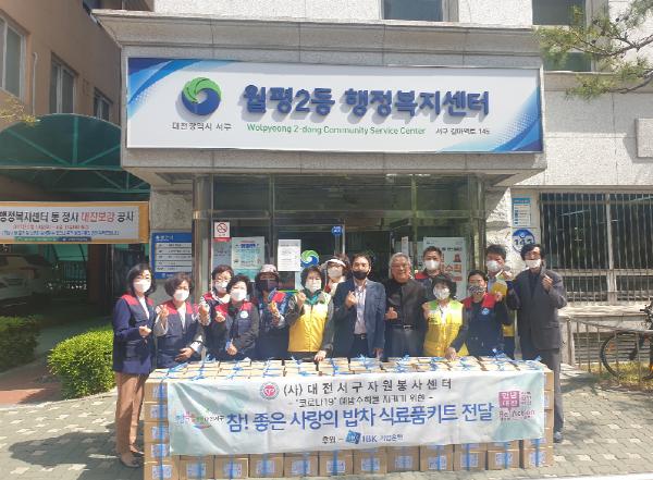‘참! 좋은 사랑의 밥차’는 대전서구자원봉사센터에서 주관하고 IBK기업은행에서 후원하여 운영하고 있었으나, 최근 코로나19 지역사회 감염 발생 및 생활 속 거리두기 실천을 위해 햇반·통조림·즉석짜장 등으로 구성된 식료품 키트로 대체해 지원에 나섰다.