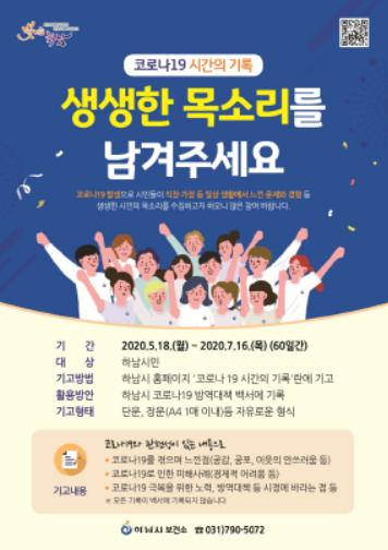 시민을 대상으로 5월 18일부터~ 7월 16일까지 60일간 시 홈페이지 링크 후‘코로나19 시간의 기록’을 통해 코로나19 관련 주제로 A4용지 1매 이내로 자유로운 형식으로 기고가 가능하다.