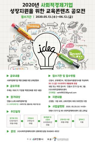 안동시는 사회적 경제기업을 대상으로 경쟁력있고 지속 가능성을 높일 수 있는 ‘사회적 경제기업 성장지원을 위한 교육콘텐츠 공모전’을 개최하고, 참가팀을 오는 6월 12일까지 모집한다.