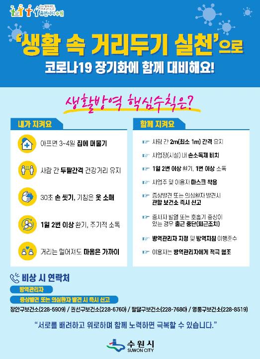 수원시는 ‘생활 속 거리두기 홍보반’을 구성해 코로나19 방역체계가 ‘생활 속 거리두기’로 전환된 5월 6일부터 음식점, 제과점 등 위생업소 2만 203개소를 대상으로 공문, 문자메시지(주 3회 이상 발송)를 발송해 세부 지침을 안내하고, 지침 준수를 요청하고 있다. 업소를 방문해 방역지침 이행 준수 여부도 점검하고 있다.