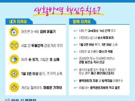 ‘개인 방역 5대 핵심 수칙’은 ▲아프면 3~4일 집에 머물기 ▲사람과 사람 사이, 두 팔 간격 건강 거리 두기 ▲30초 손 씻기, 기침은 옷소매 ▲매일 2번 이상 환기, 주기적 소독 ▲거리는 멀어져도 마음은 가까이 등이다.
