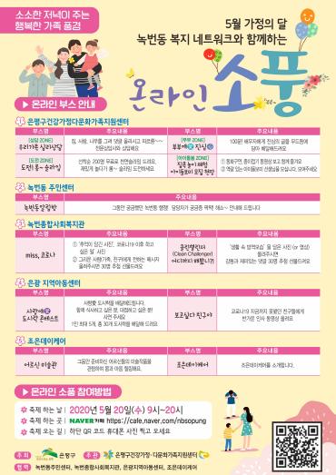온라인 ‘소풍’은 5월 20일부터 24일까지 진행되며, 네이버 카페(https://cafe.naver.com/nbsopung) 또는 하단의 QR코드를 통해 접속하여 가입 후 참여 가능하다. 자세한 문의는 은평구 가족정책과(☎02-351-6237),은평구건강가정·다문화가족지원센터(02-376-3761)로 하면 된다.