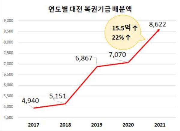14일 대전시에 따르면 2021년도 복권기금은 총 86억 2,200만 원으로 올해 70억 7,000만 원 보다 총 15억 5,200만 원(22%) 늘어났다.