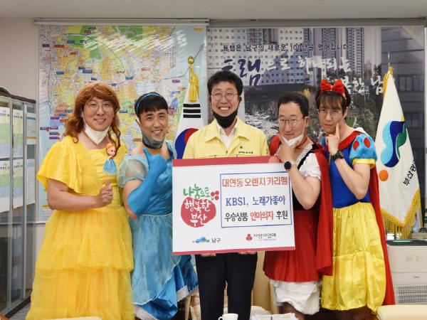 남구 대연동 공동체하우스 ‘일오집’에 사는 30~40대로 구성된 대연동 오렌지카라멜(강수윤, 김한수, 윤창환, 조영제)은 지난 12일, KBS1 TV ‘노래가 좋아’출연 1승 상품으로 받은 안마의자를 부산 남구(구청장 박재범)에 기탁했다.