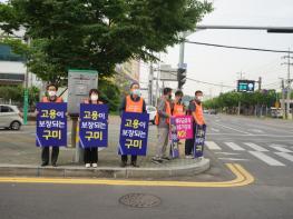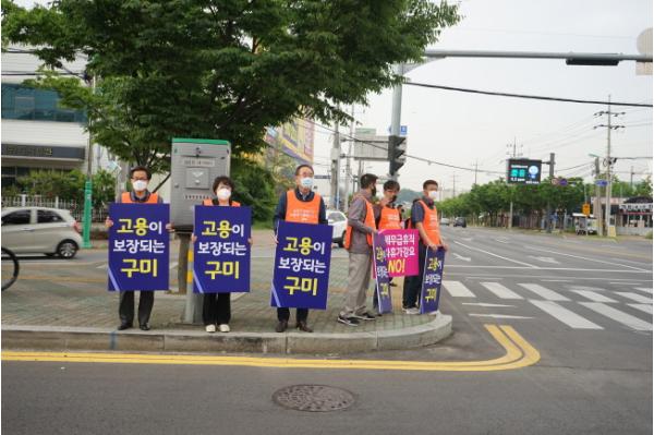 구미시 노사민정협의회(공동위원장 장세용, 김동의), 구미시 상생일자리협의체, 한국노총 구미지부 회원 50여명은 5. 14(목) 07:00 구미 홈플러스 사거리에서 ‘고용이 보장되는 구미’를 슬로건으로 출근길 홍보 활동을 대대적으로 펼쳤다.