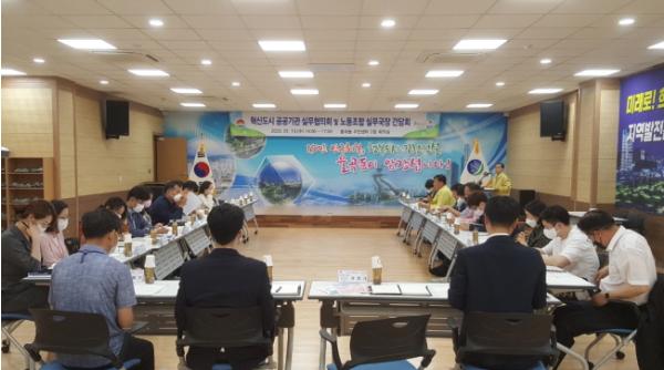 김천시(시장 김충섭)는 지난 13일 율곡동 주민센터 2층 회의실에서 혁신도시 공공기관 실무협의회와 노동조합 실무국장 간담회를 개최하여 신종 코로나 감염증 확산 방지를 위한 방역대책 및 지역경제 살리기에 협력할 수 있는 방안 모색과 혁신도시 발전을 위한 협력을 더욱 공고히 다지는 한편, 정주여건에 대한 애로사항을 청취하는 등 다양한 의견을 수렴했다.
