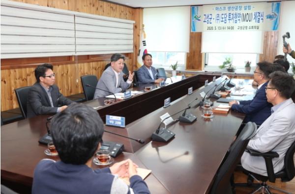 고성군(군수 백두현)은 지난 13일 오후 2시경 군청 소회의실에서 백두현 군수와 ㈜도담 김경령, 임양희 공동대표 등 관계자 10여 명이 참석한 가운데 마스크 생산공장 설립을 위한 70억 원 규모의 투자협약(MOU)을 체결했다.