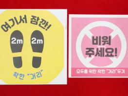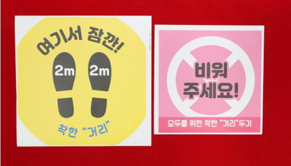 안내 스티커는 공연장이나 관람석 등 실내와 공원 벤치에서 한 자리 띄어 앉기를 유도하는 ‘벤치?좌석용’과 앞 사람과의 일정 거리를 유지할 수 있는 ‘줄서기용’ 총 2종류이다.