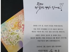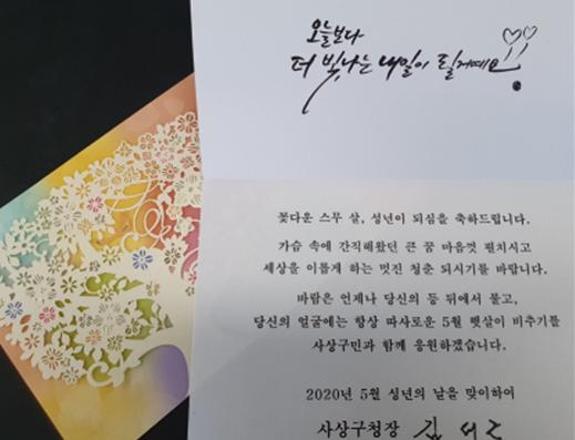 김대근 사상구청장은 축하카드에 “가슴 속에 간직해왔던 큰 꿈을 마음껏 펼치고, 세상을 이롭게 하는 멋진 청춘이 되기를 바라며, 바람은 언제나 당신의 등 뒤에서 불고, 당신의 얼굴에는 항상 따사로운 5월의 햇살이 비추기를 응원한다.”라고 적었다.