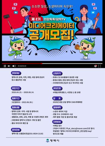 평택시(시장 정장선)는 공식 소셜 방송국 ‘희망톡톡 평택TV’와 함께할 미디어크리에이터 2기를 모집한다고 15일 밝혔다.