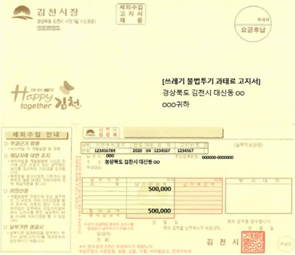김천시는 폐기물관리조례에 따라 휴지 등 휴대하고 있는 폐기물 투기 과태료 5만원, 비닐봉지 등 간이보관 기구를 이용한 폐기물 투기 과태료 20만원, 차량 등 운반장비를 이용한 폐기물 투기 과태료 50만원 등의 과태료를 부과하고 있다.