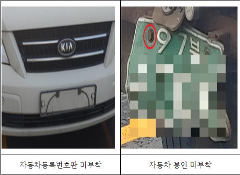 자동차등록번호판 및 봉인 미부착은 자동차관리법 제10조 1항 위반사항으로 과태료 50만원이 부과될 수 있으며,